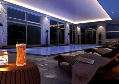 - Benutzung des Wellnessbereiches inklusive Panorama-Indoorpool, Saunen, Dampfbad, Salzstollen, Infrarotkabine, verschiedene Erlebnisduschen und Wasserbetten